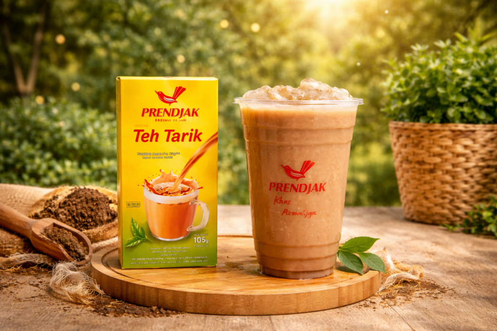 For a more practical home version, Prendjak Teh Tarik can be used since it already has a well-balanced flavour. Brew it first with hot water and stir well before adding ice. This method helps maintain the distinct teh tarik taste even when served cold.